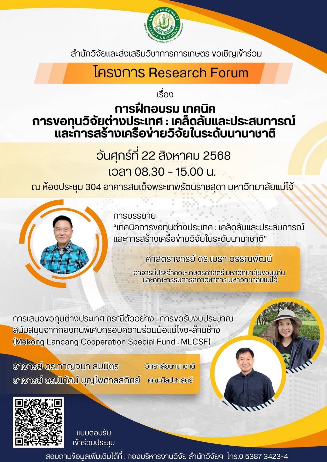 On Friday, August 22, 2025, the Research Promotion and Development Office, Maejo University, organized a Research Forum under the theme “Techniques for Applying International Research Grants: Insights, Experiences, and Building International Research Networks.”
